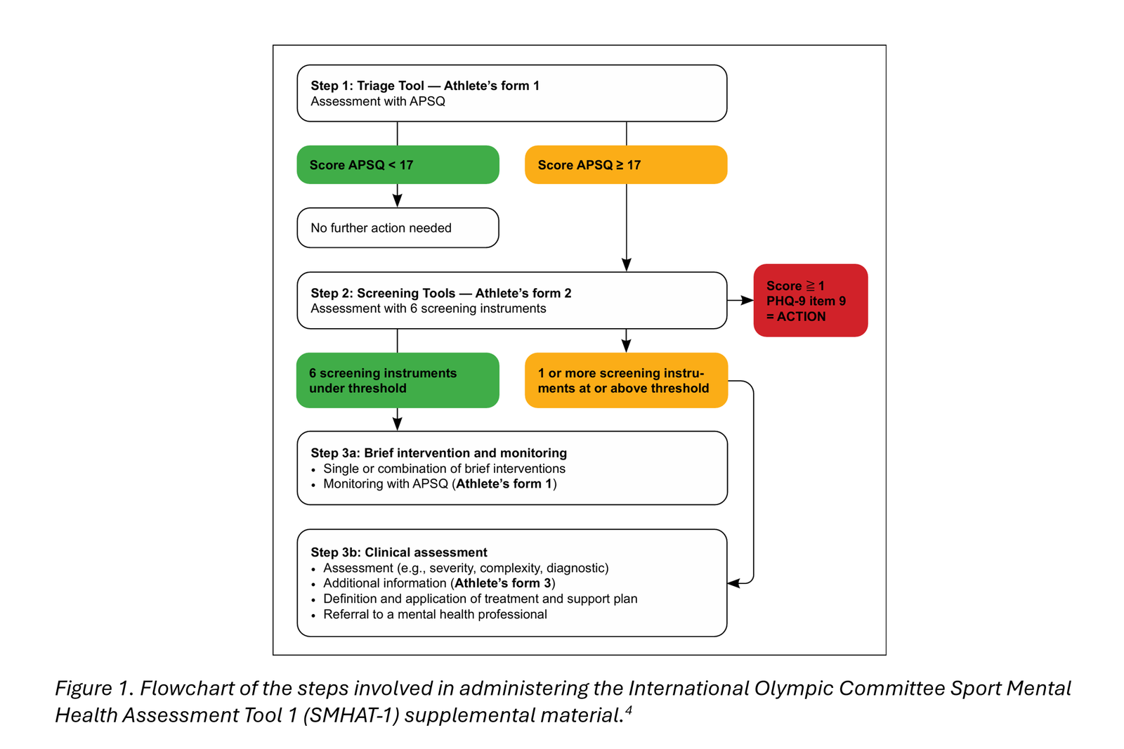After the intervention(s), the athlete will be reassessed using Athlete’s Form 1 (back to Step 1). If positive (score of 17 or greater), the athlete bypasses Step 2 and proceeds to Step 3b.